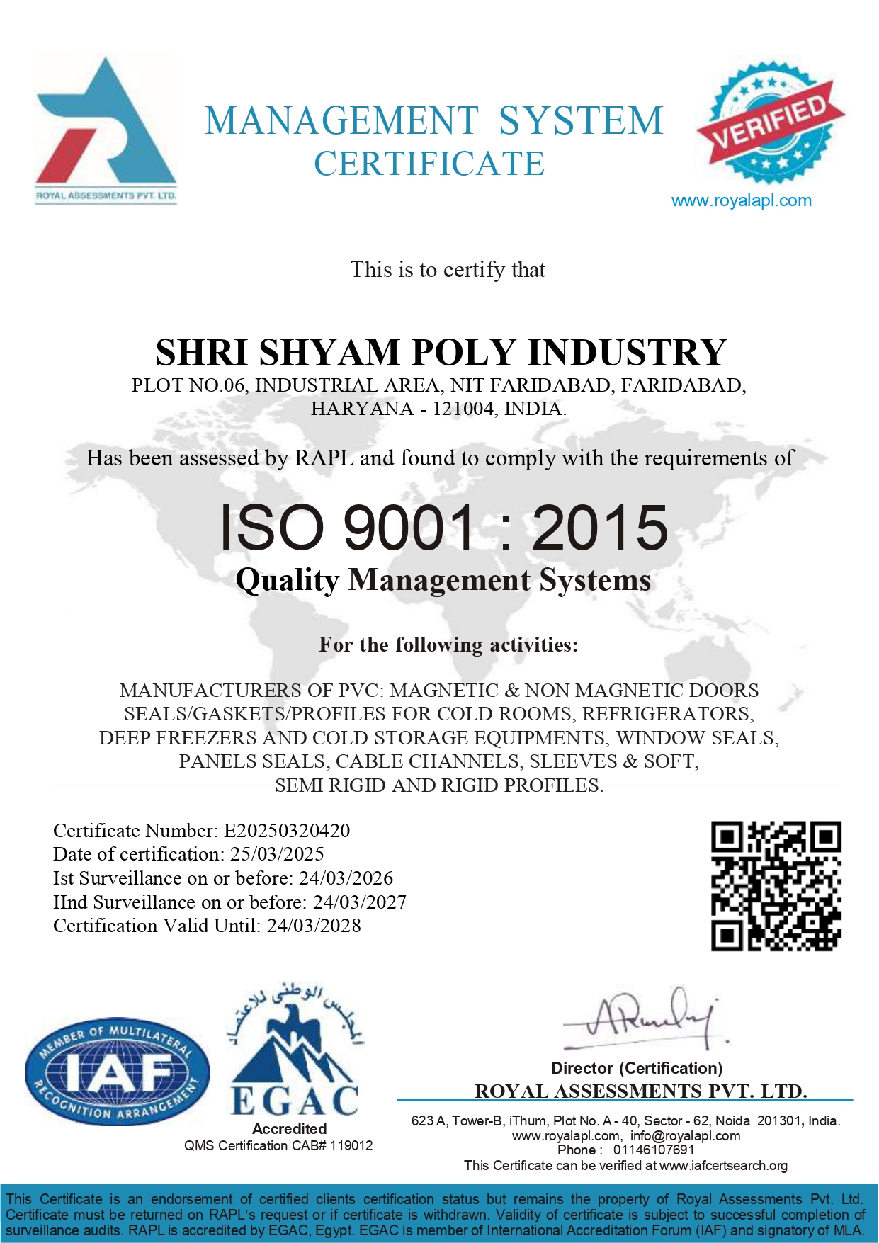 Every product manufactured at Shri Shyam Poly Industry — including our PVC rigid profiles, PVC soft profiles, freezer door gaskets, magnetic door seals, and PVC sleeves — is manufactured under our ISO 9001:2015 certified quality management system.